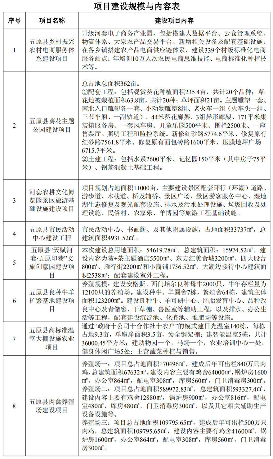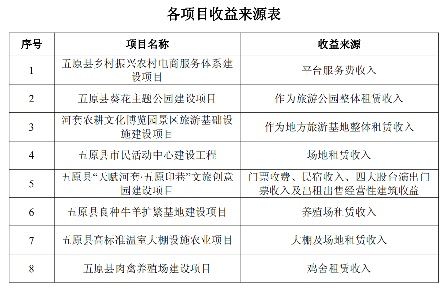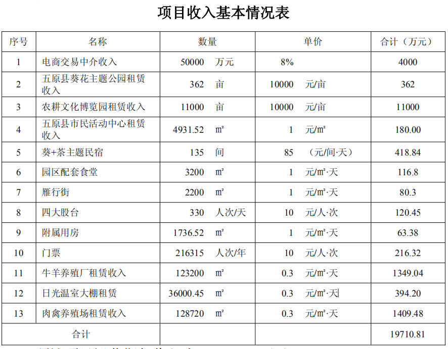 項(xiàng)目主要建設(shè)內(nèi)容為為五原縣農(nóng)村產(chǎn)業(yè)融合發(fā)展示范園建設(shè)內(nèi)容集農(nóng)業(yè)種植、養(yǎng)殖、加工、旅游為一體的三產(chǎn)融合示范園,本方案具體建設(shè)內(nèi)容如下表:本方案項(xiàng)目總投資151559.17萬(wàn)元,資金來(lái)源為政府投資122559.17萬(wàn)元,計(jì)劃申請(qǐng)專項(xiàng)債融資29000萬(wàn)元。截止2020年9月14日,已累計(jì)發(fā)行27600萬(wàn)元。5.門票收費(fèi)、民宿收入、四大股臺(tái)演出門票收入及出租出售經(jīng)營(yíng)性建筑收益;